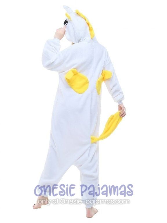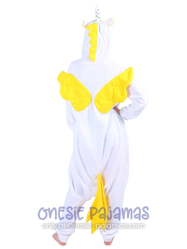 This Gold and White Unicorn Onesie is an Adult onesie pajamas Kigurumi costume for men and women featuring a design of a Unicorn with white and yellow fur.