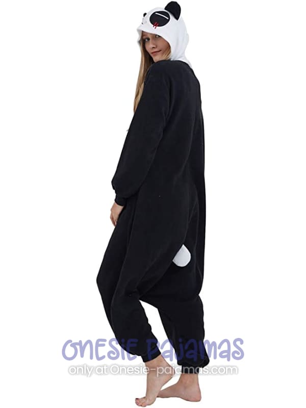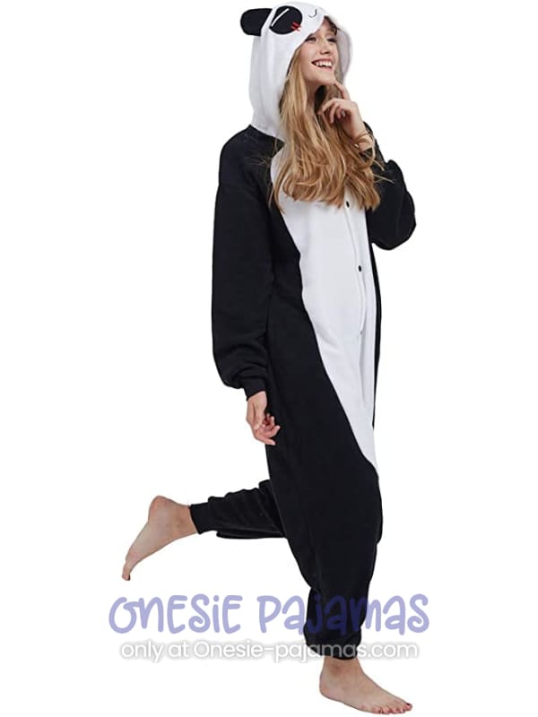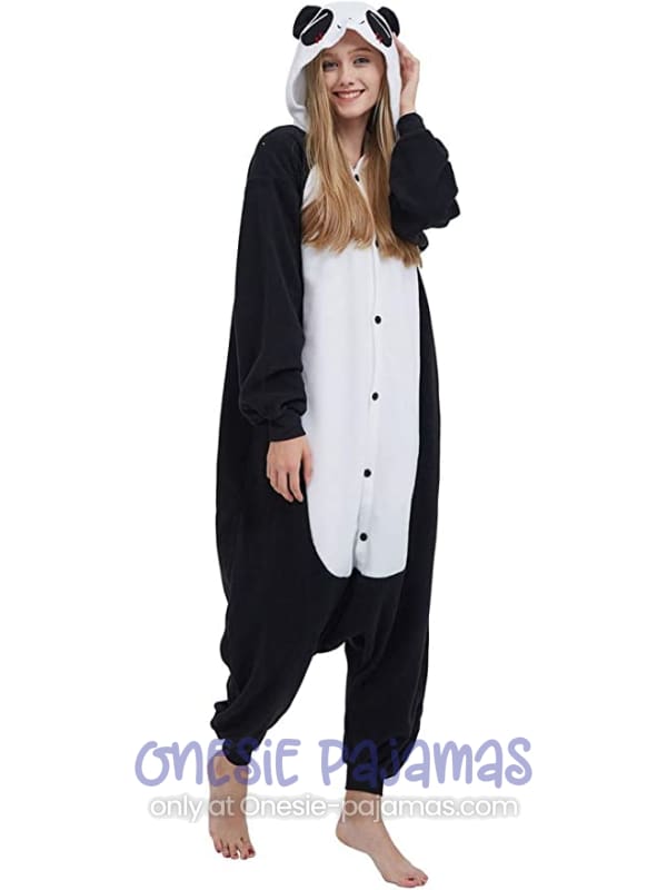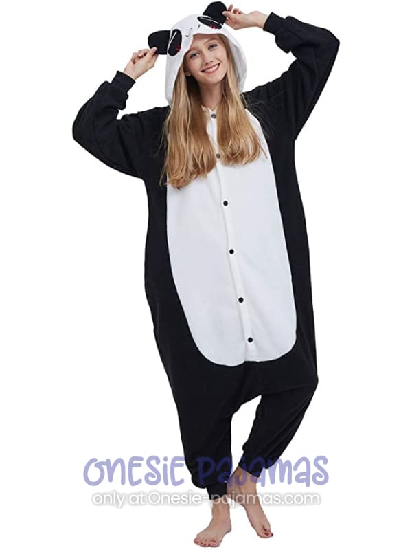 This Cute Panda Onesie is an Adult onesie pajamas kigurumi costume for men and women featuring a design of a black and white panda with happy eyes and a lovely smile.