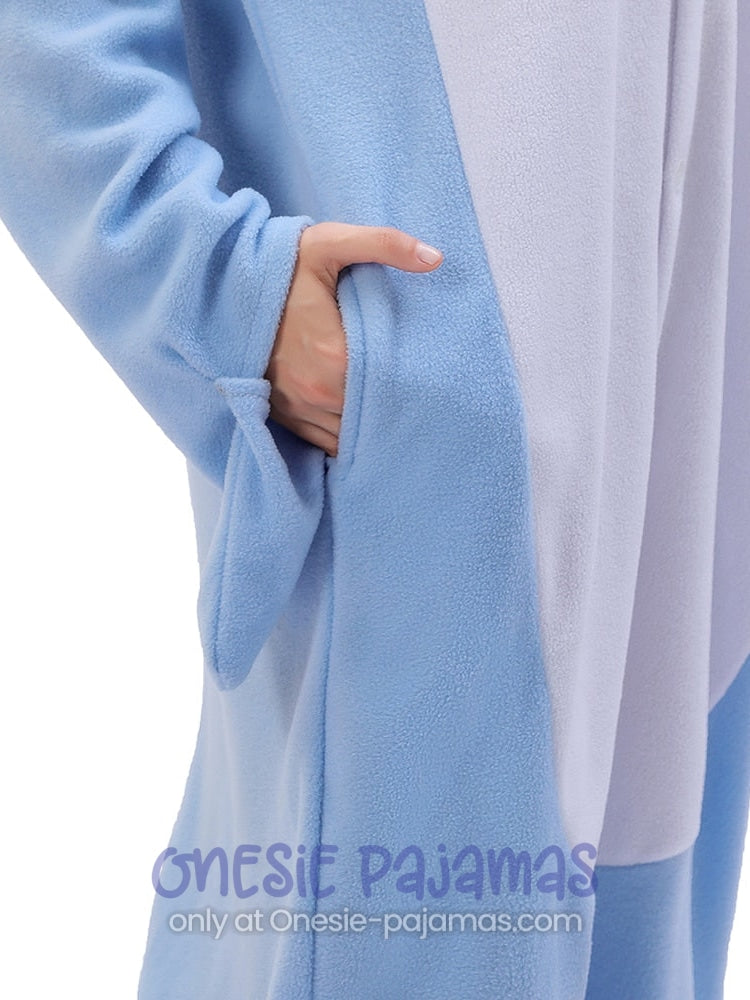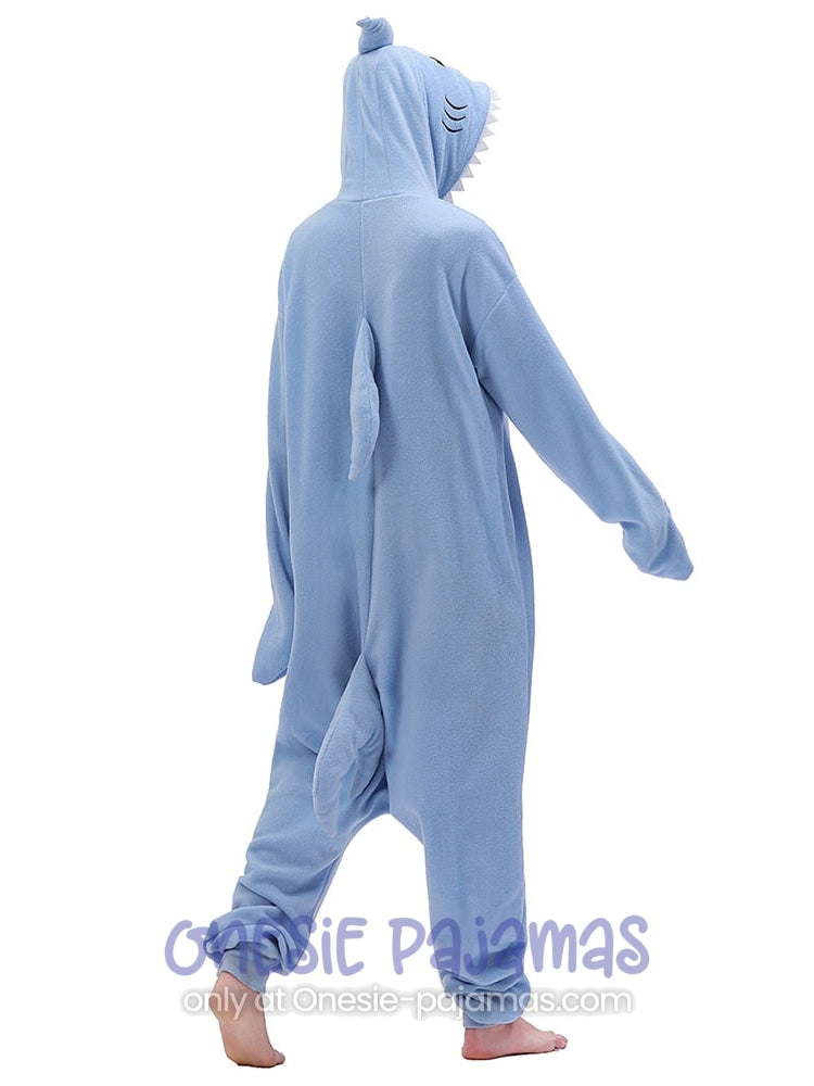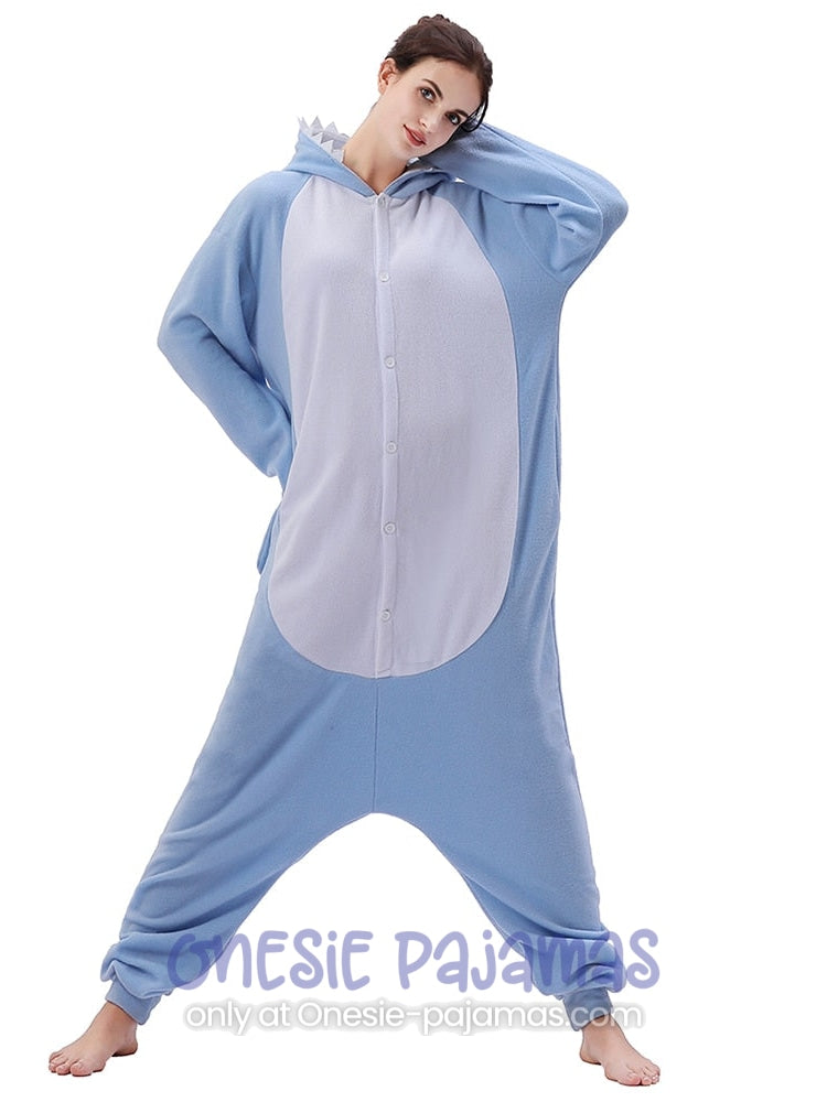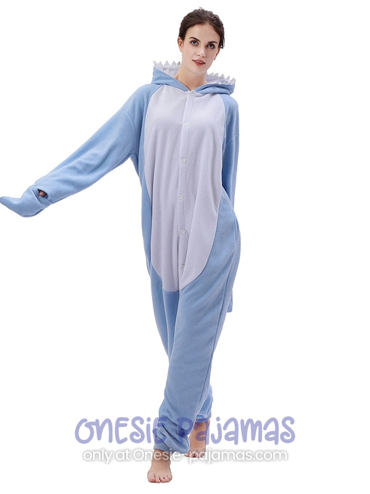 This Light Blue Shark Onesie is an Adult onesie pajamas Kigurumi costume for men and women featuring a design of a Light Blue and white shark with gloves and teethed hood!