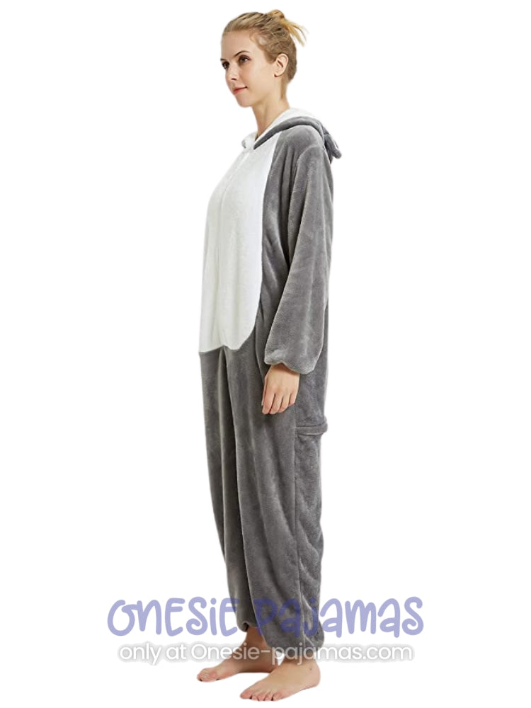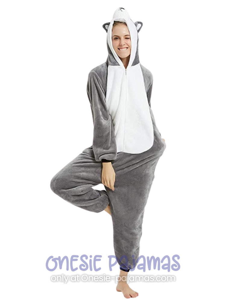 This Husky Wolf Onesie is an Adult onesie pajamas Kigurumi costume for men and women featuring a design of a grey and white Husky dog.