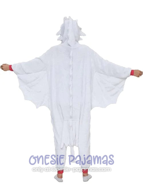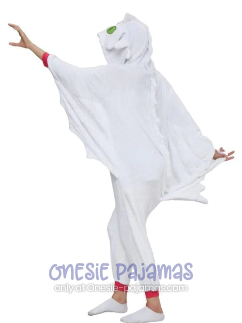 This Light Fury Onesie is an Adult onesie pajamas kigurumi costume for men and women featuring a design of the famous white dragon from the movie How to Train Your Dragon Night Fury!