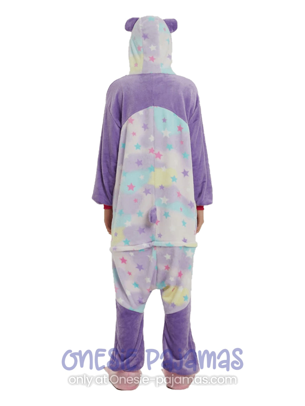 This Kawaii Panda Onesie is an Adult onesie pajamas kigurumi costume for men and women featuring a design of a very cute purple and white panda with a starry fur!