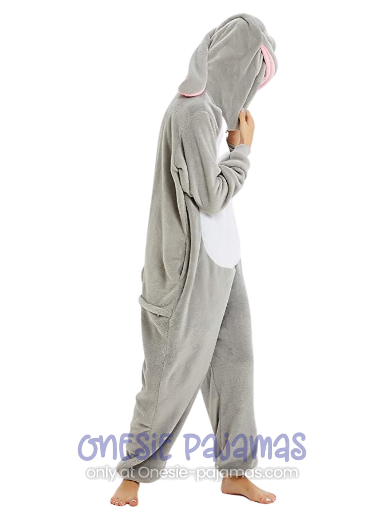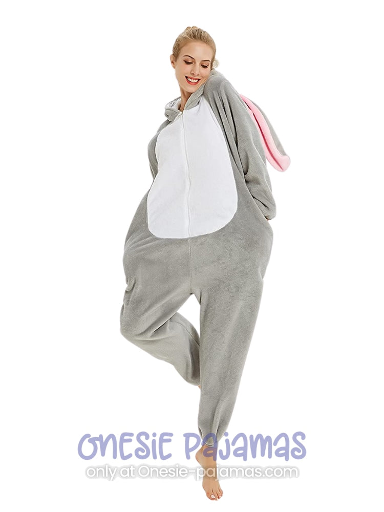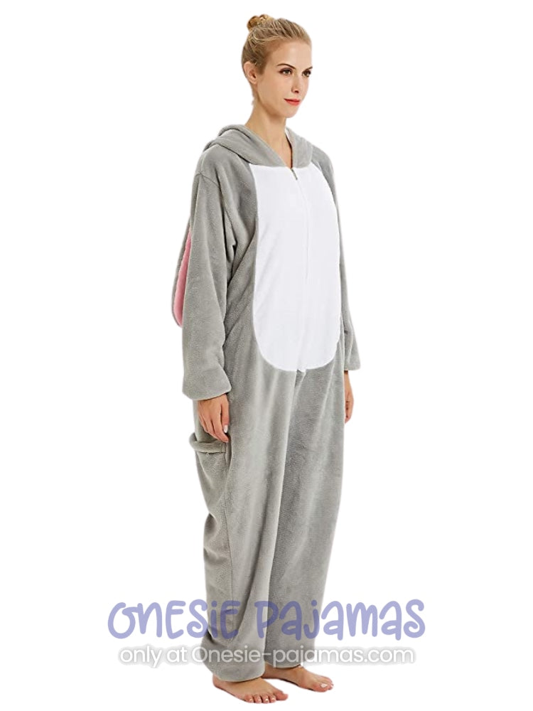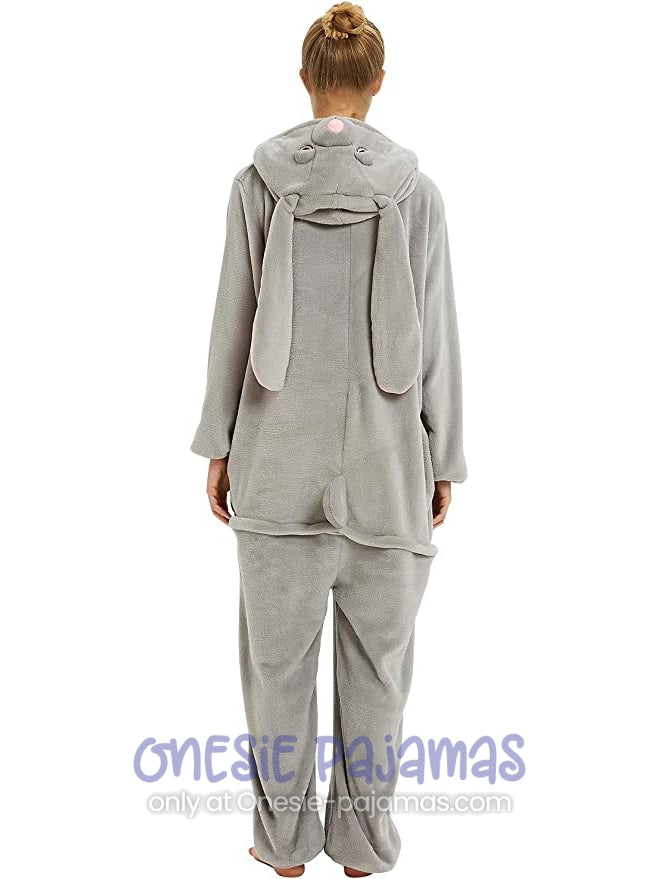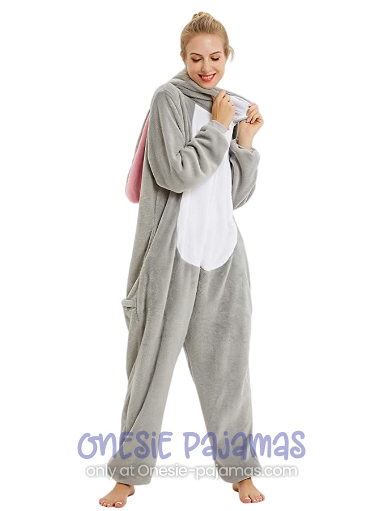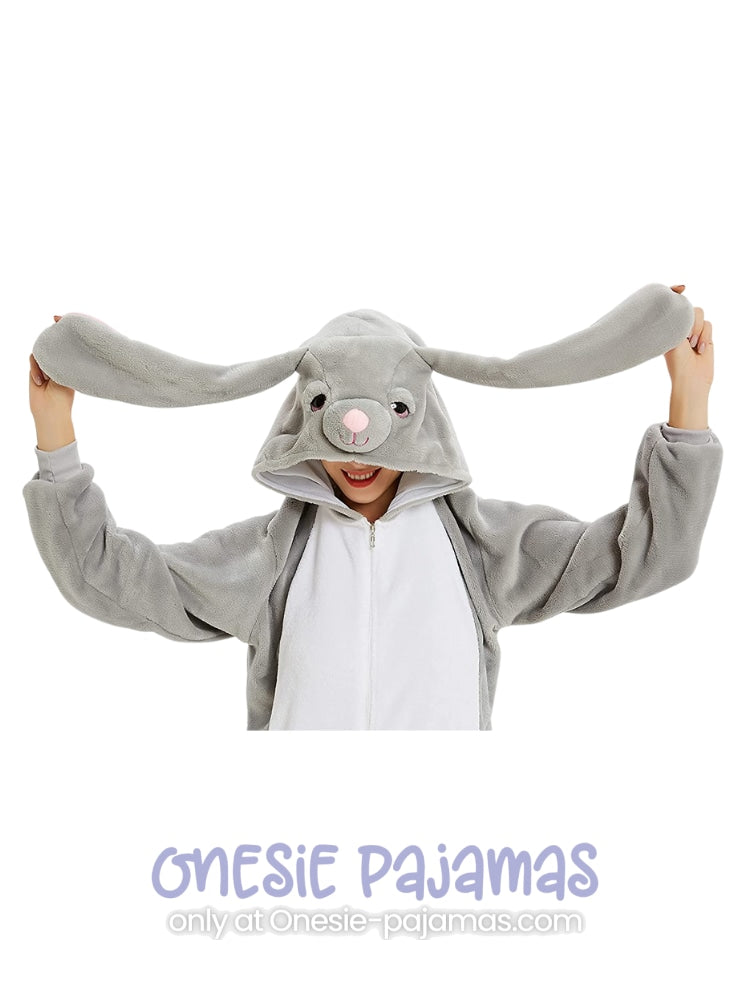 This Bunny Onesie is an Adult onesie pajamas Kigurumi costume for men and women featuring a design of a gray and white bunny rabbit.