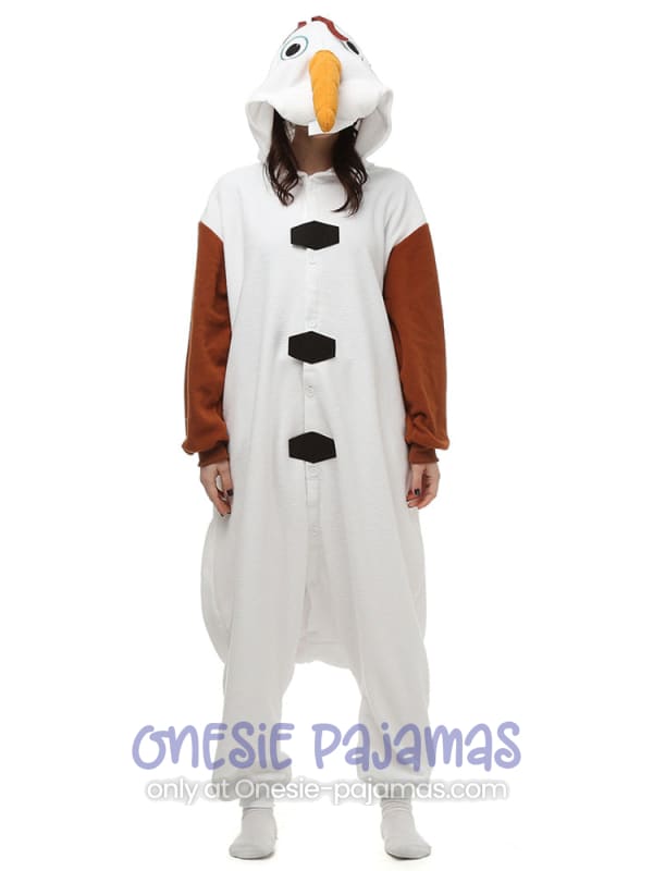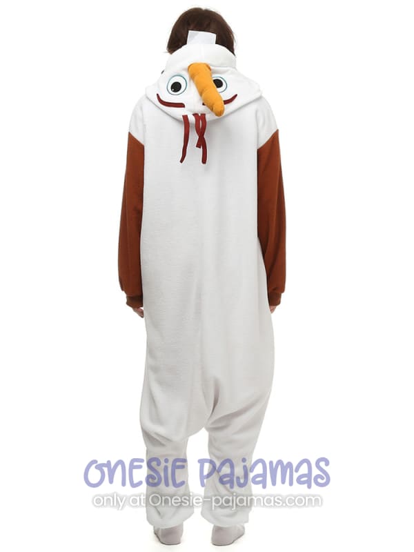 This Snowman Onesie is an Adult onesie pajamas Kigurumi costume for men and women featuring a cute design of a Snowman with brown sleeves and big carrot nose!