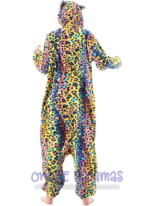 This Rainbow Leopard Onesie is an Adult onesie pajamas Kigurumi costume for men and women featuring a design of a Leopard with a rainbow and white collar fur.