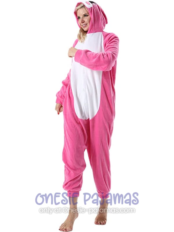 This Pink Bunny Rabbit Onesie is an Adult onesie pajamas Kigurumi costume for men and women featuring a design of a rabbit with pink fur, big ears and a cute face.