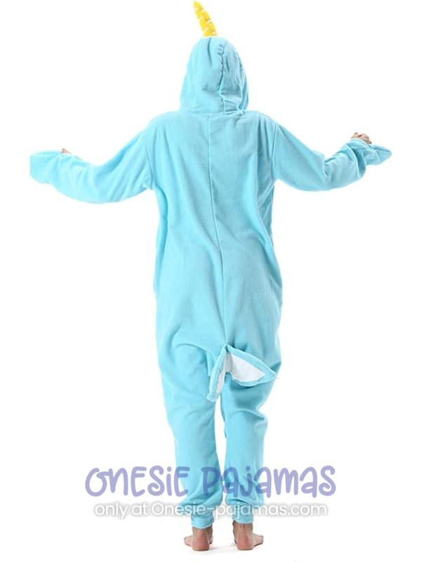 This Blue Whale Onesie is an Adult onesie pajamas kigurumi costume for men and women featuring a design of a blue and white whale with a big yellow horn.