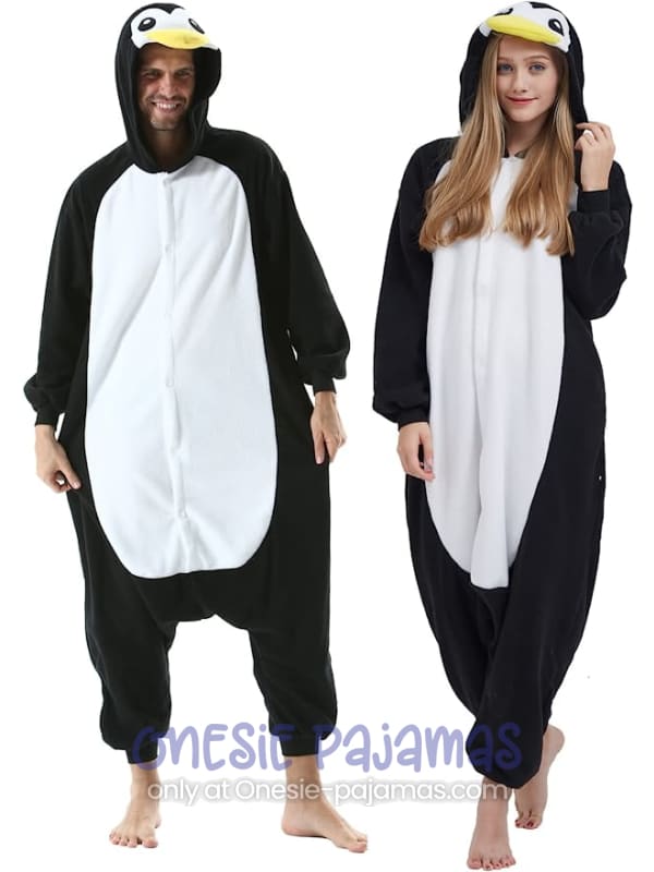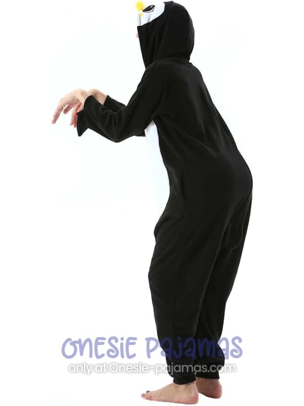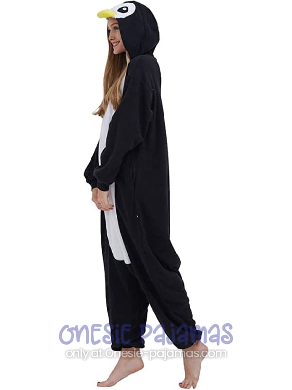 This Penguin Onesie is an Adult onesie pajamas Kigurumi costume for men and women featuring a design of a black and White Penguin with a yellow beak.