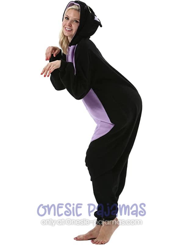 This Midnight Cat Onesie is an Adult onesie pajamas Kigurumi costume for men and women featuring a design of a black and purple cat with yellow eyes and cute ears.